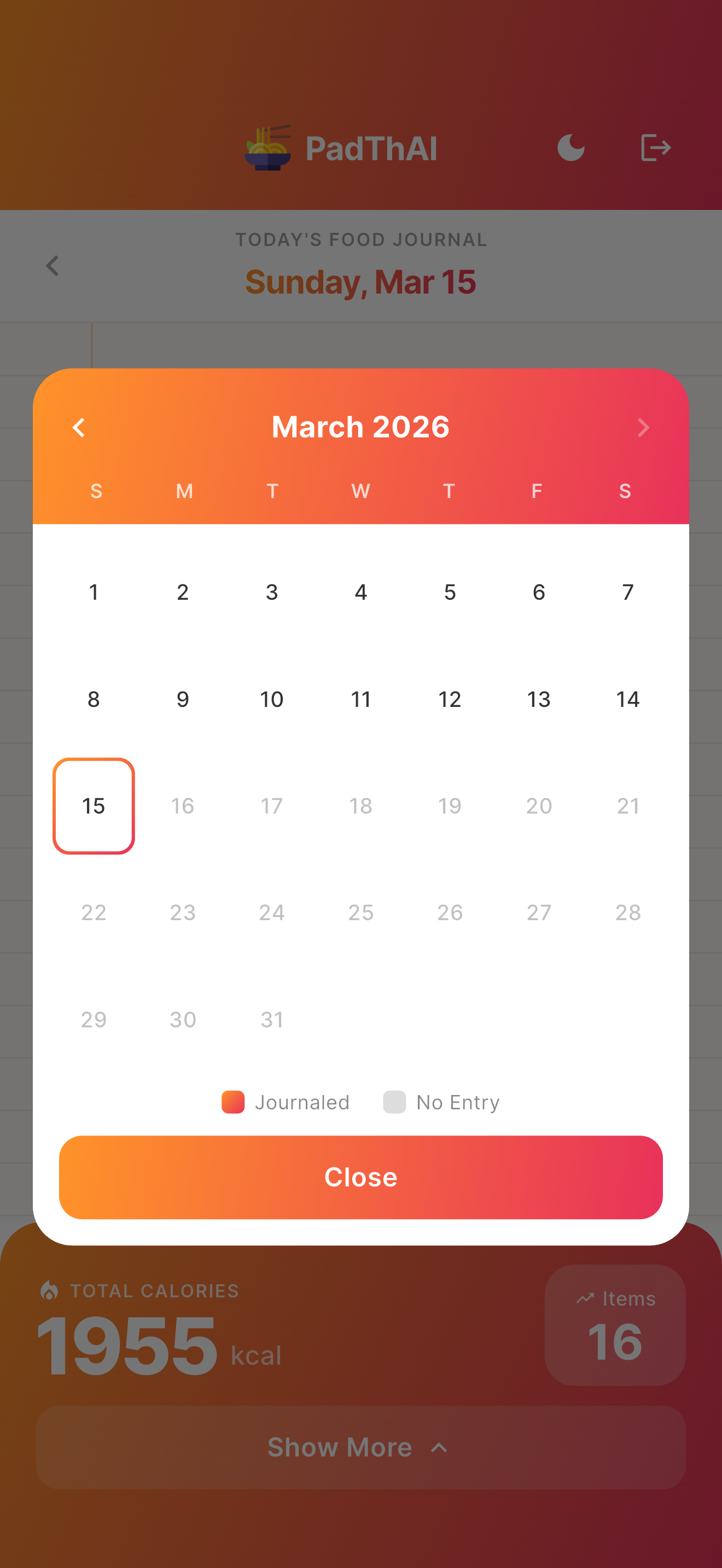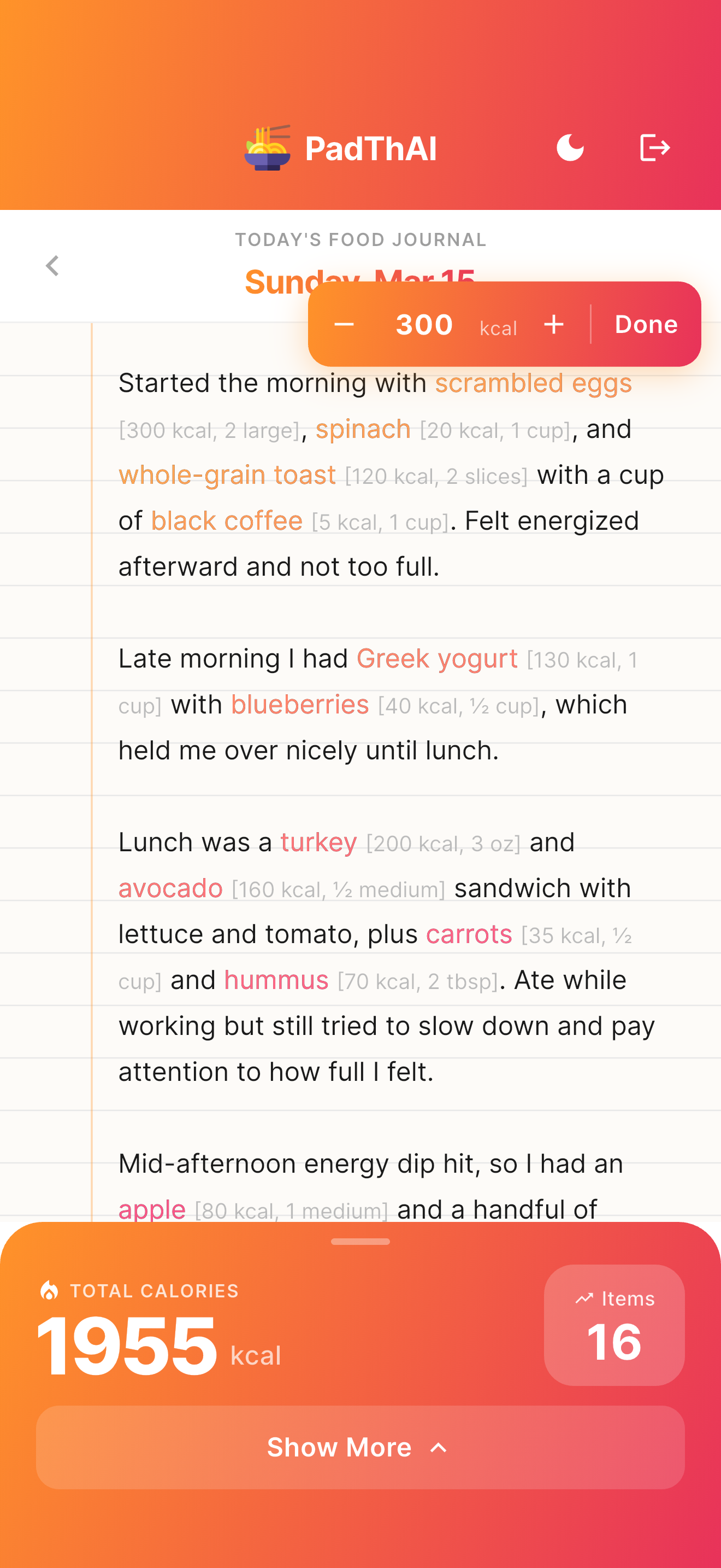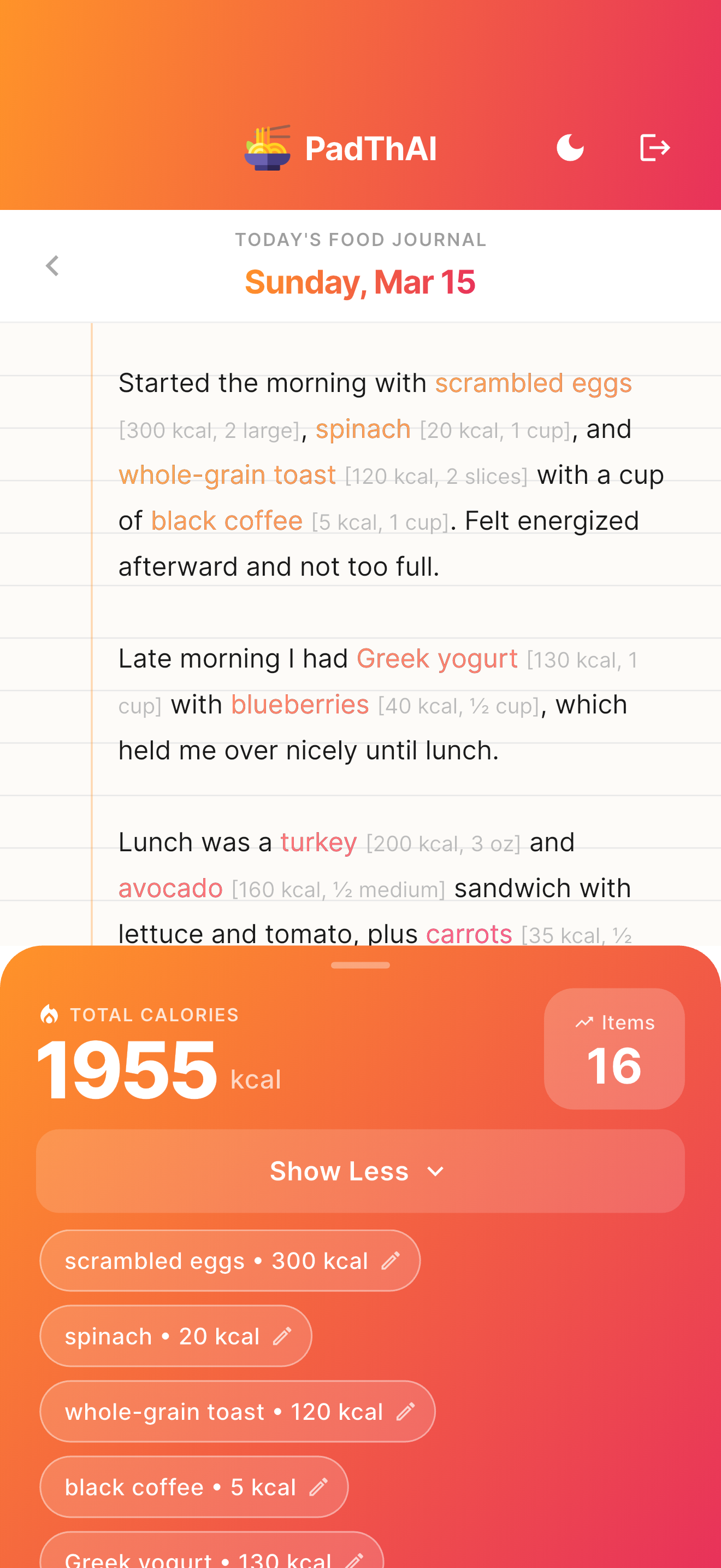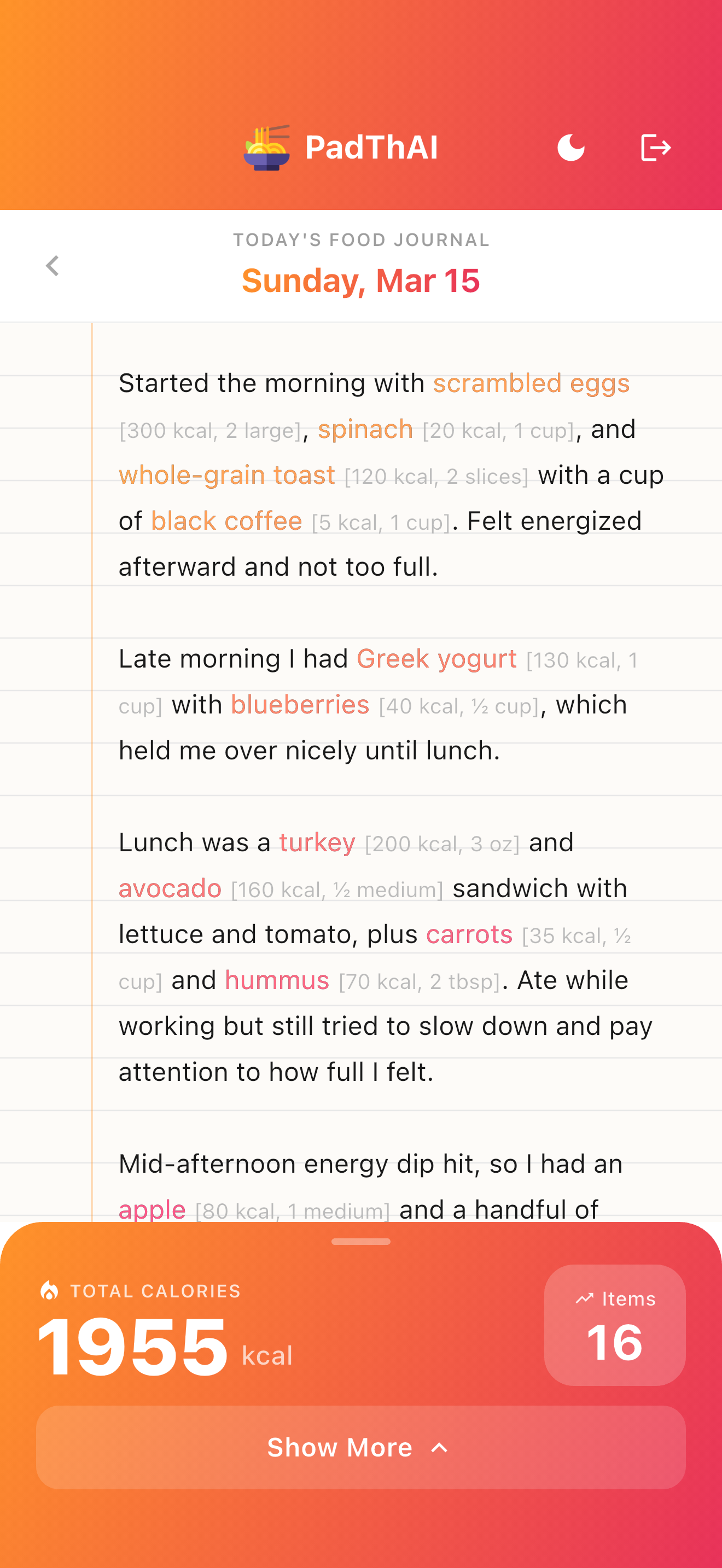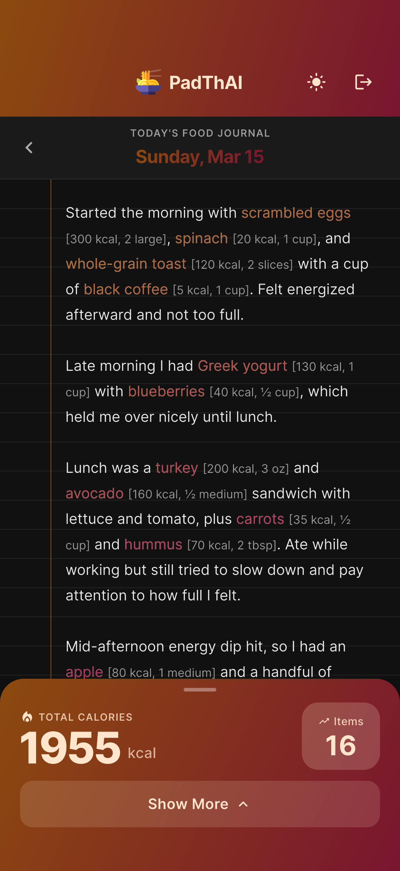 AI Journal & Nutrition Tracker — Just write naturally about your meals, snacks, and drinks. PadThAI automatically extracts nutrition information, calculates calories, and identifies the foods you've eaten throughout the day.